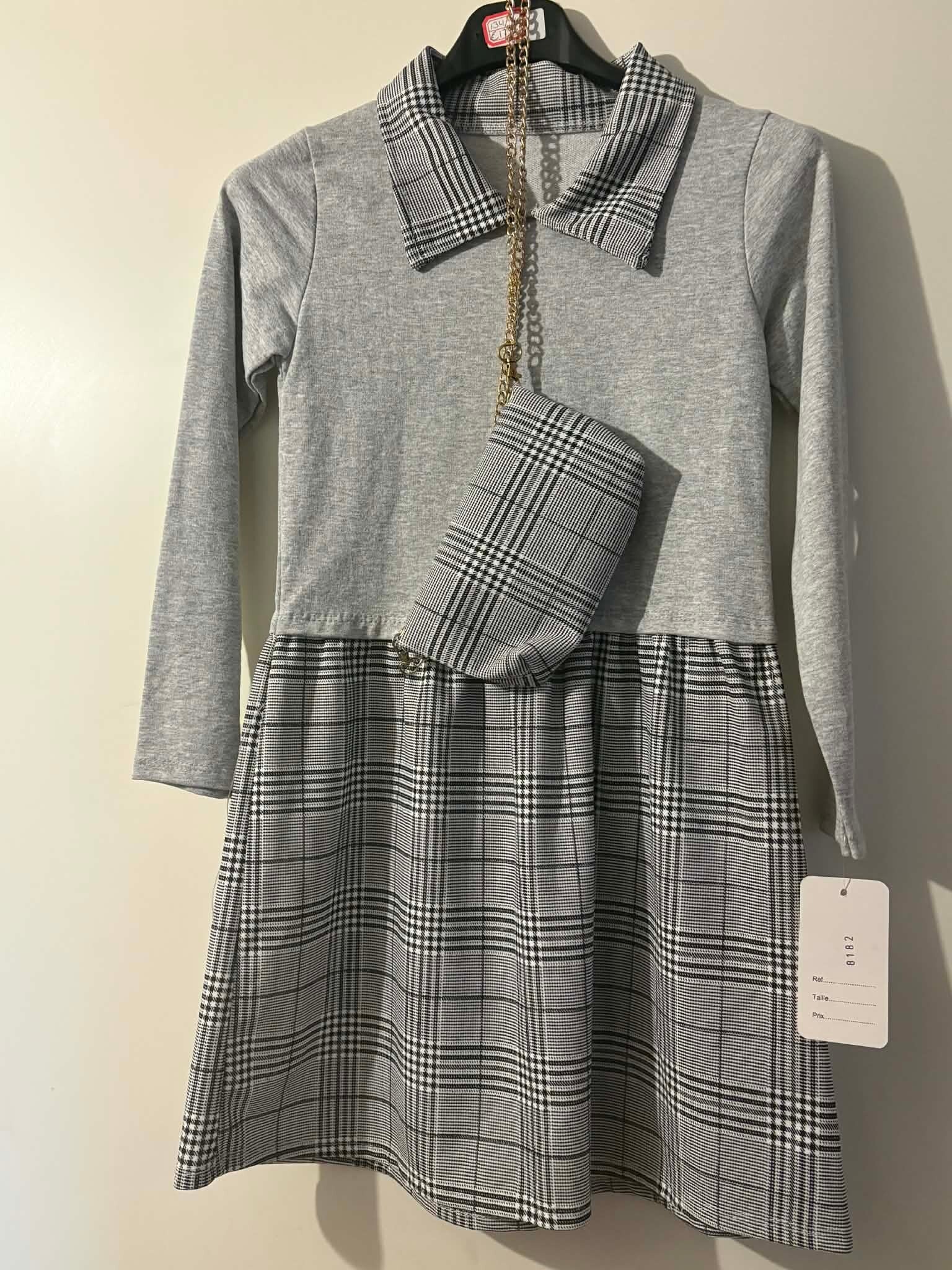 Grijs streep jurkje voor meisjes met een bijpassend tasje. Gemaakt van een comfortabele stof en voorzien van een speels streeppatroon. Geschikt voor dagelijks gebruik en speciale gelegenheden.